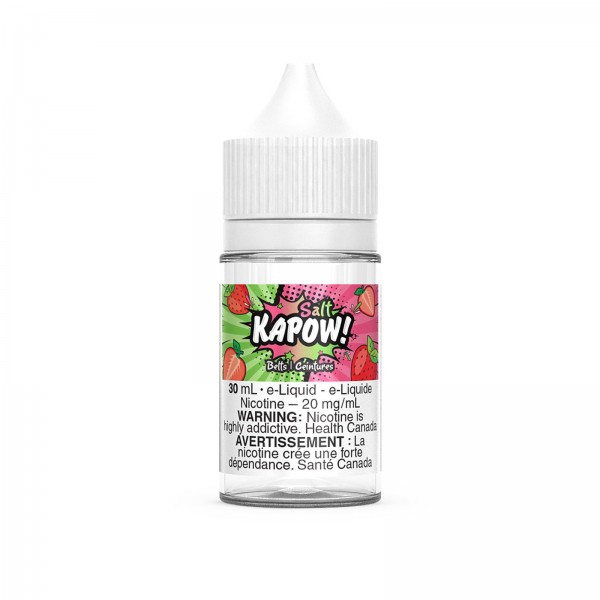DescriptionBelts SALT Kapow Salt E-Liquid is a delicious candy flavor made of sweet strawberries and finished off with a blast of sour!Kapow Salt is NOT intended for use in Sub-Ohm Tank systems. Kapow Salt E-Liquid is intended for small pod systems. Quick Links:Kapow E-Liquid CollectionKapow SALT Co..